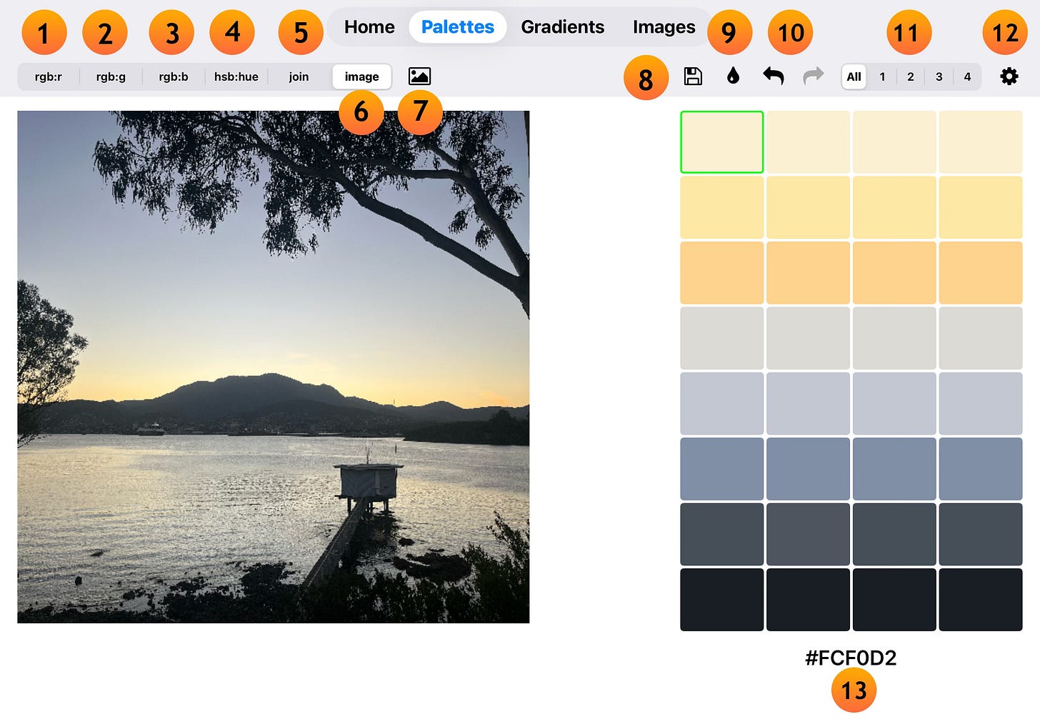 image - load an image from your Photos app and pick colours directly. In the sample shown, the colour picker is in image mode.